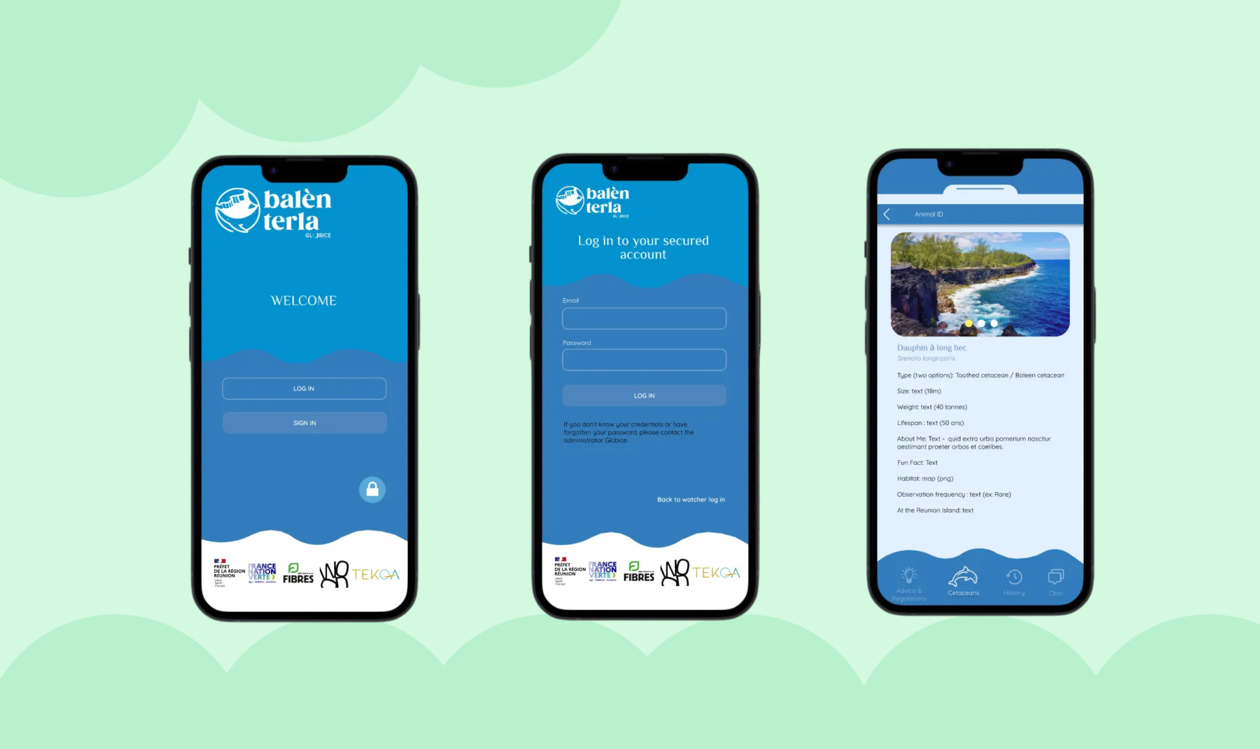 Balèn Terla, developed for Globice Réunion in partnership with Wild Immersion, transforms coastal whale watching into accessible citizen science. Available on App Store and Google Play, the app grew rapidly to 38,000 downloads and 45,000 registered users across two seasons. Users log real-time humpback whale sightings from Réunion Island’s coastline, directly fueling marine conservation research.